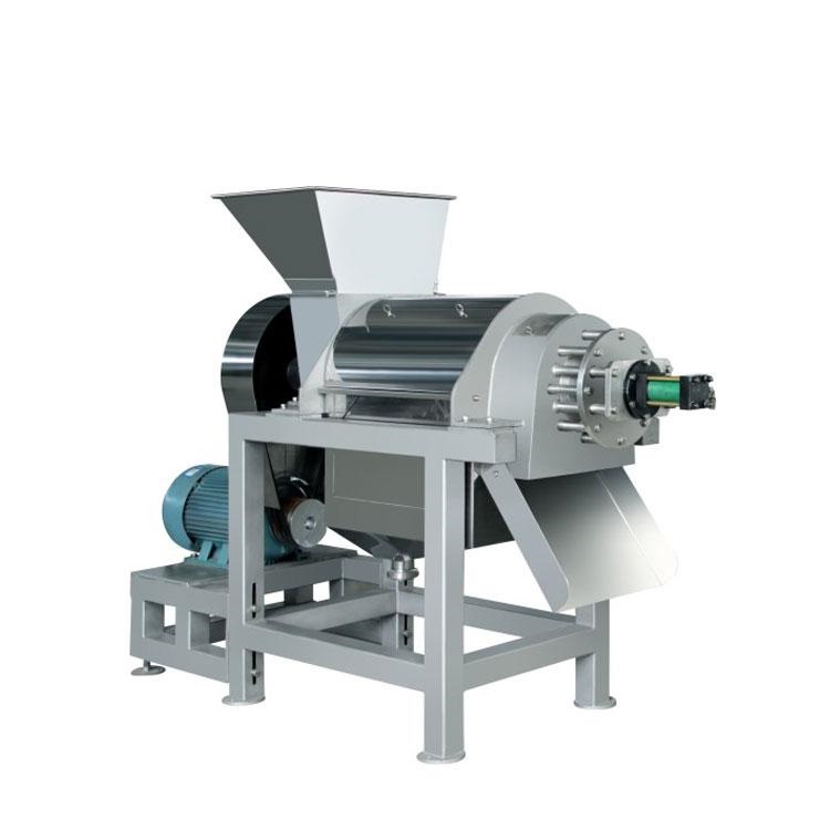 螺旋主轴的转动方向从进料斗向渣槽方向看去,为顺针时方向。原料加入进料斗中,在螺旋的推进下受压,其压榨的汁液通过过滤网流入底部的盛汁器,而废料则通过螺旋及调压头的锥形部分之间形成的空隙排出,调压头沿轴向的移动可调整空隙的大小。用手顺时针(从设备的出渣槽向进料斗看)转运手轮轴承座时,调压头向左,空隙即缩小,反之则空隙变大。改变空隙的大小,即调整出渣的阻力,即可改变出汁率,但如果空隙过小,在强力挤压下,部分渣的颗粒会和汁一起通过过滤网被挤出,尽管出汁增加,但汁的质量相对下降,空隙的大小应视用户具体工艺要求而定。